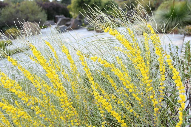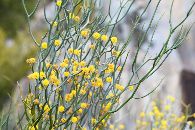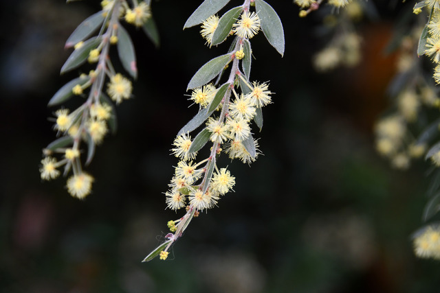 Some highlights include: a unique red cultivar called Acacia leprosa ‘Scarlet Blaze’, Acacia denticulosa (Sandpaper Wattle), which is nicknamed the ‘twisties’ wattle due to its flowers’ resemblance to the snack, Acacia aphylla (Leafless Rock Wattle), a Western Australian species that evolved without leaves due to environmental selection pressures; and Acacia cultriformis (Knife-leaf Wattle), which has been grafted to look as though it is growing upside down.