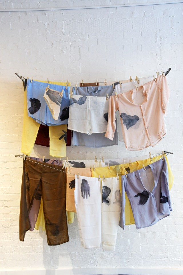 The placement of the printed hands on the clothes is deliberate as physical touch between the father and son “disappeared” once they became teenagers.
