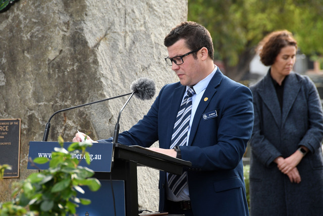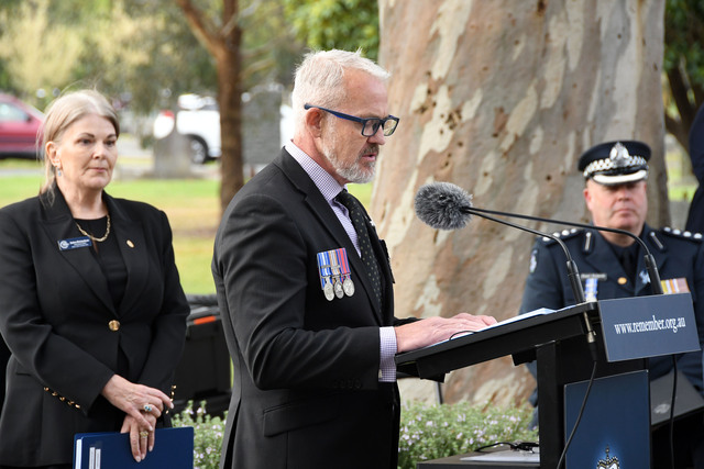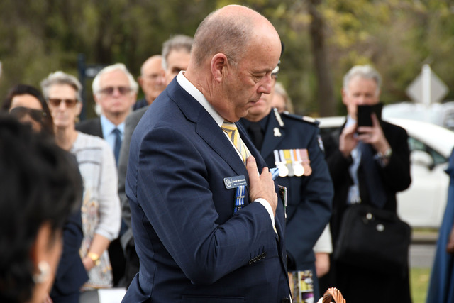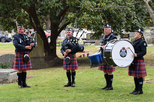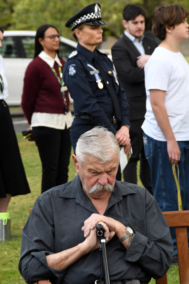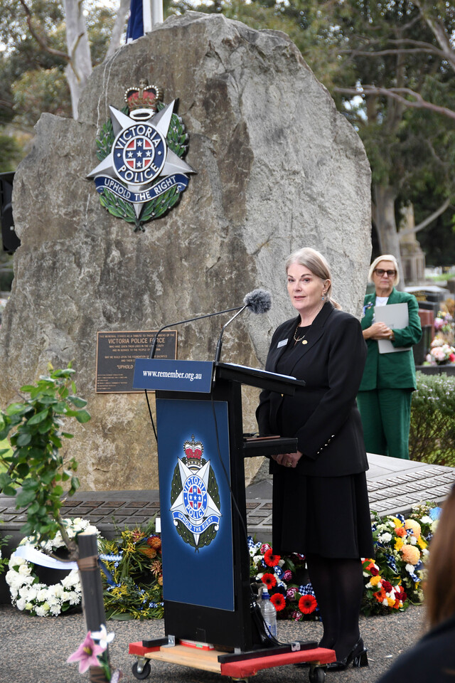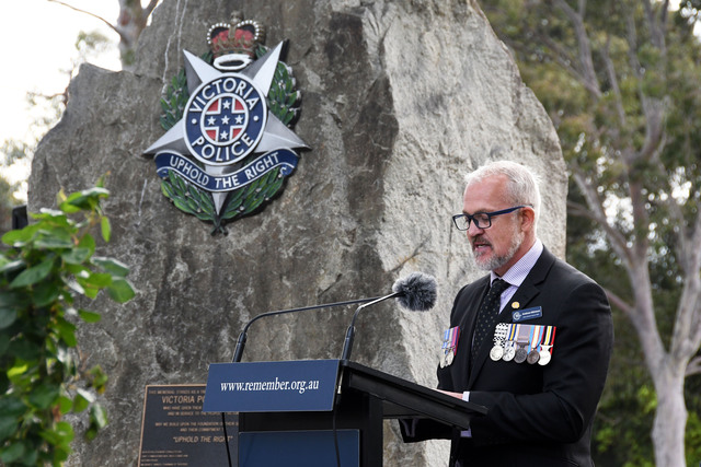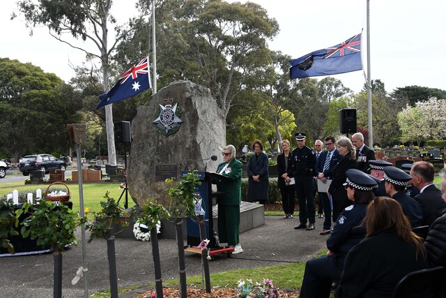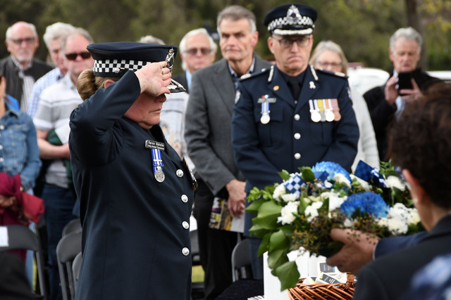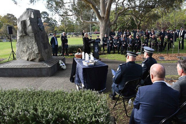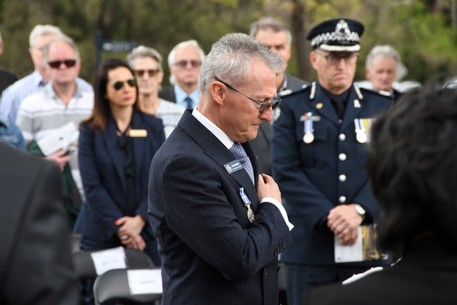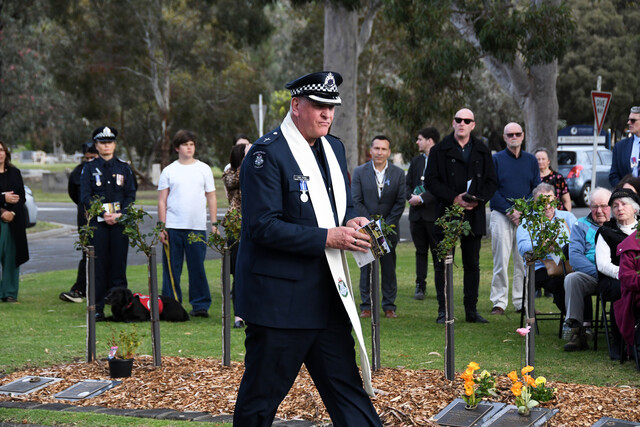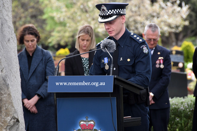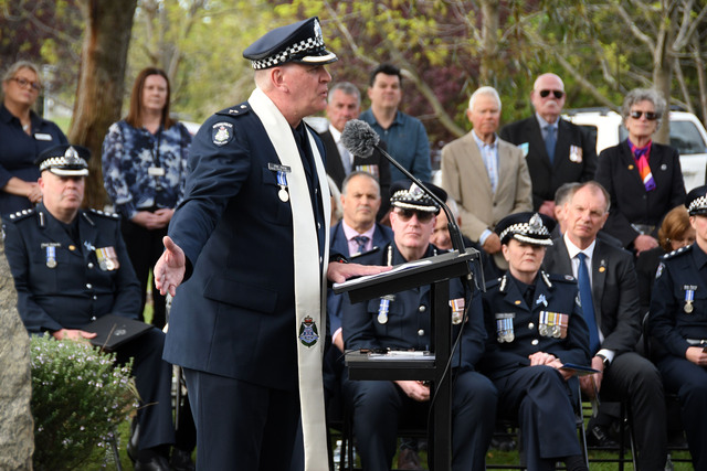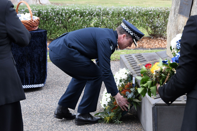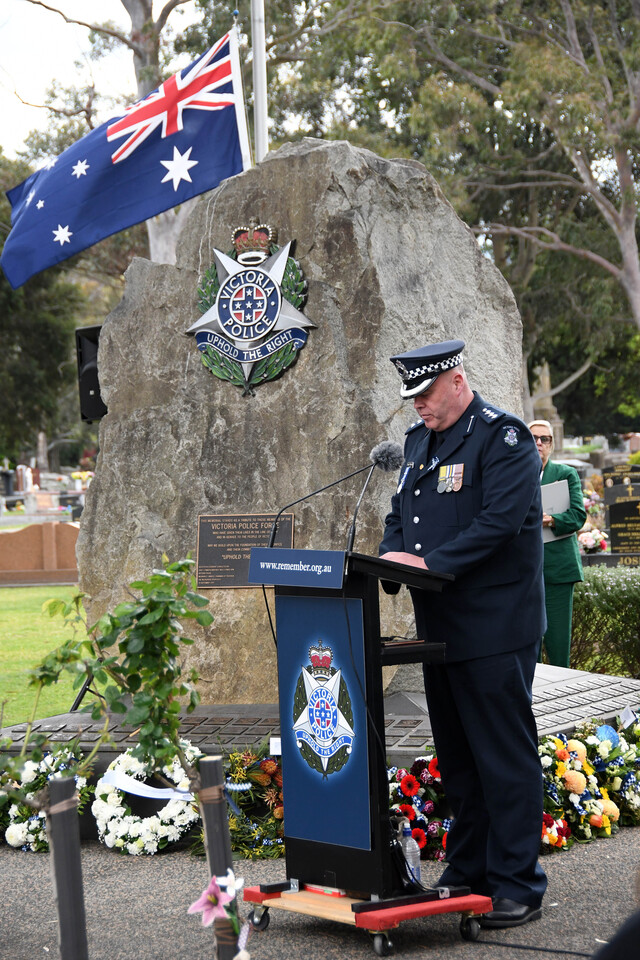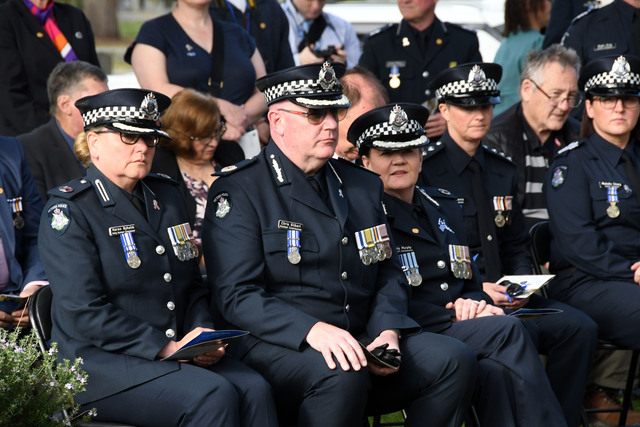Victoria Police members, veterans, MPs, councillors, family members, friends gathered at the stone monument, paying their respects to those who died in the line of duty at the annual service on National Police Remembrance Day and Blue Ribbon Day.