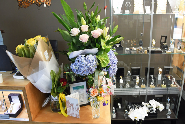 The beloved jewellery store, which on Tuesday was scattered with glass from the consequent damage of the robbery, has now been adorned with a colourful array of flowers and cards from the community.